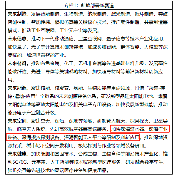 深海科技产业链涵盖从上游的材料、核心零部件以及基础技术,到中游的深海装备制造,直至下游的应用服务。